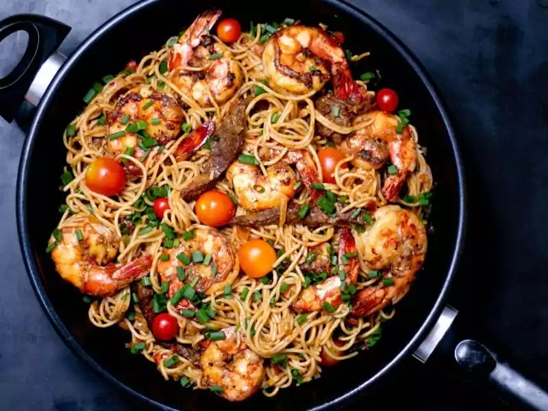 As this particular type of pasta is very thin and light, it goes perfectly with soups, seafood and light sauces. Unlike other pastas, you can eat a lot without getting full – which is a bonus when a dish is this delicious! Our take on this Italian classic includes fresh lobster and flying fish rose, enlivened by liberal helpings of garlic, fiery chilli flakes and olive oil.